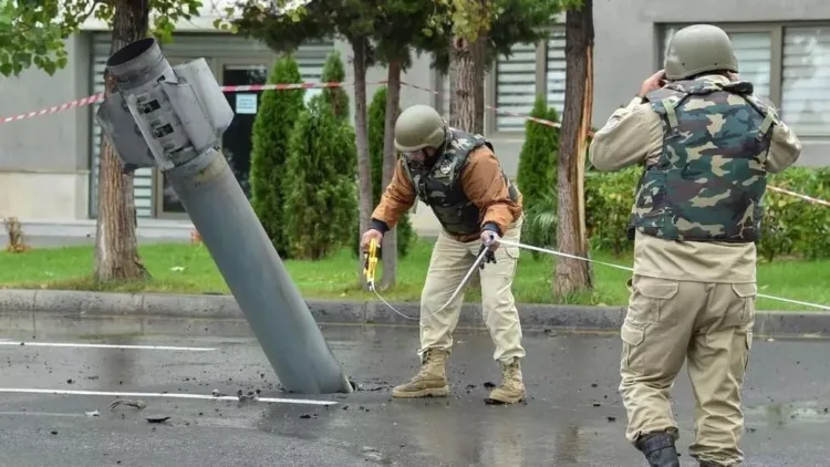 Foto: Fuerzas azeríes acordonan un cohete sin detonar lanzado por fuerzas armenias sobre la población de Mingachevir en Azerbaiyán, el 5 de octubre de 2020. © Stringer vía Reuters