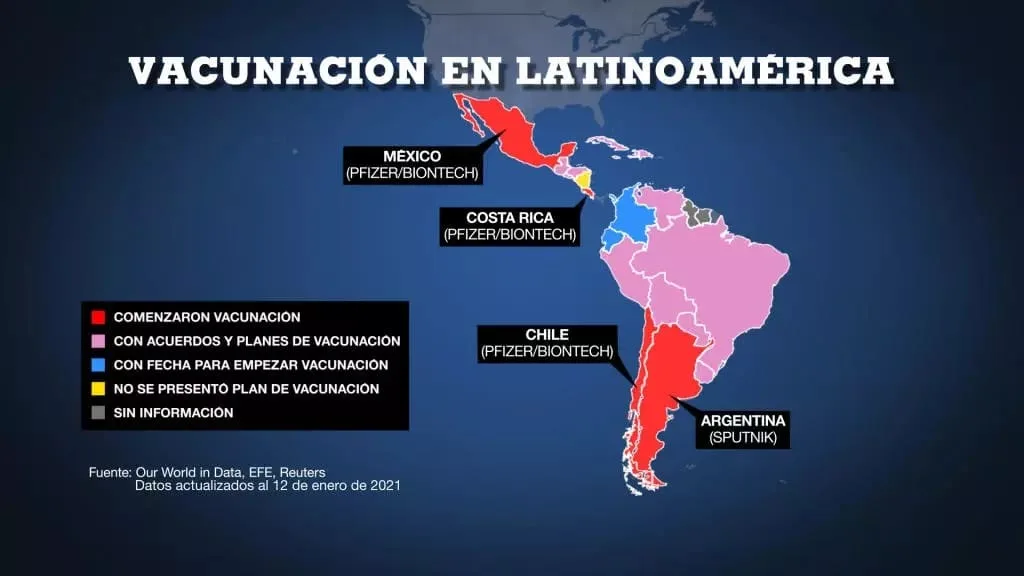 En la región, sólo cuatro países han dado inicio a la inmunización de su población: México, Chile, Costa Rica y Argentina. Mientras el virus arrecia con un alza de contagios, los países enfrentan dificultades para asegurar las vacunas, necesarias para superar la pandemia.