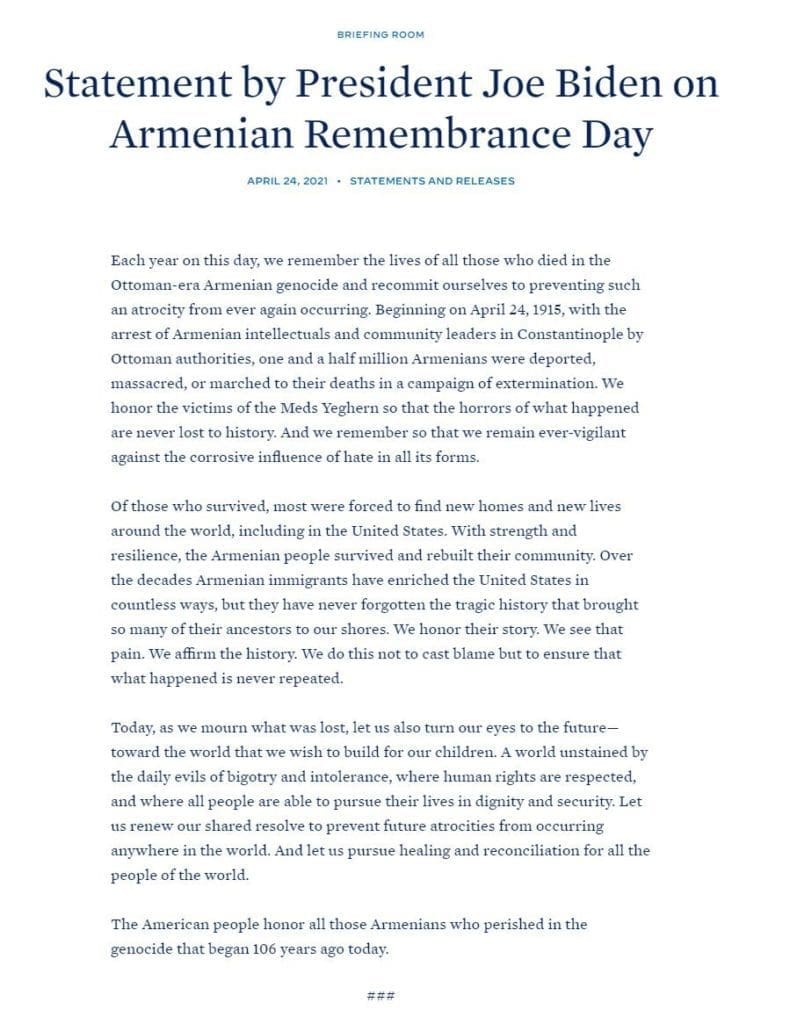 Con el reconocimiento, Biden cumplió con una promesa de campaña que hizo hace un año. El sábado en la conmemoración anual del Día de Recuerdo del Genocidio Armenio, expresó que los eventos de 1915 a 1923 fueron un esfuerzo deliberado para acabar con los armenios.