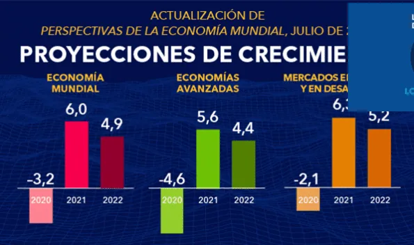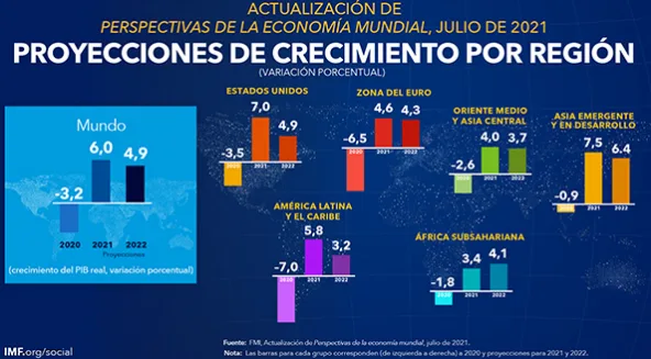 El FMI mejoró la perspectiva de crecimiento económico de la Argentina en 2021. Para el organismo internacional, el país tendrá un crecimiento del 6,4 %. En abril, se proyectaba una mejora de 5,8%. Se estima que a nivel mundial será de 6 % para este año y de 4,9 % para el 2022.