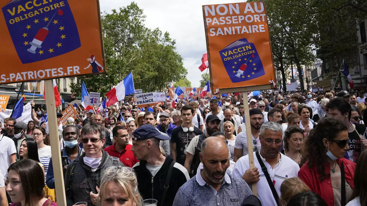 El Gobierno de Emmanuel Macron sigue adelante con la ampliación de la tarjeta sanitaria ya existente a los cafés, los restaurantes y los viajes interurbanos el lunes, a pesar de cuatro fines de semana de protestas airadas que vieron a casi un cuarto de millón de personas manifestarse en todo el país el sábado.