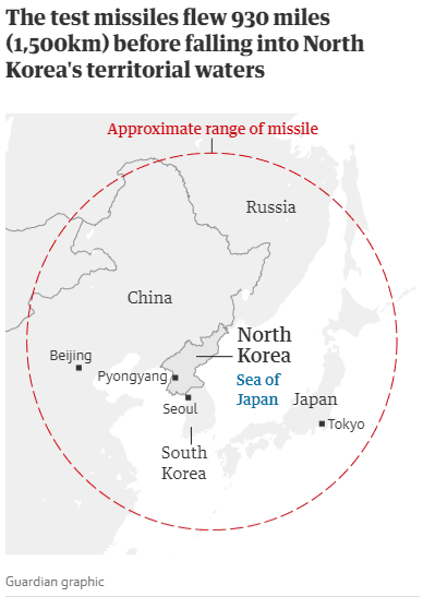 Los misiles de prueba volaron 930 millas (1.500 km) antes de caer en las aguas territoriales de Corea del Norte. The Guardian