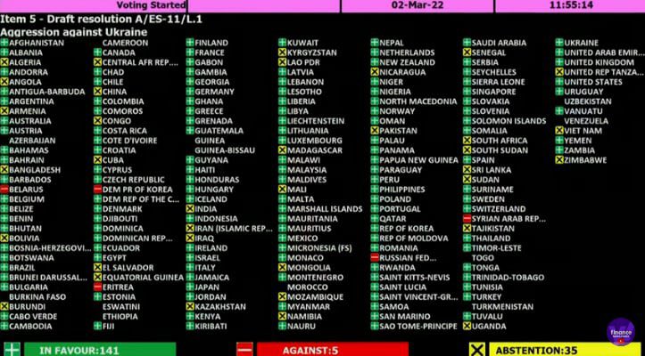 La Asamblea General de Naciones Unidas (ONU) tenía programada una votación para este miércoles en pos de resolver cual sería el accionar hacia Rusia luego de la invasión de Ucrania, luego de escuchar los 120 discursos ofrecidos por los representantes.