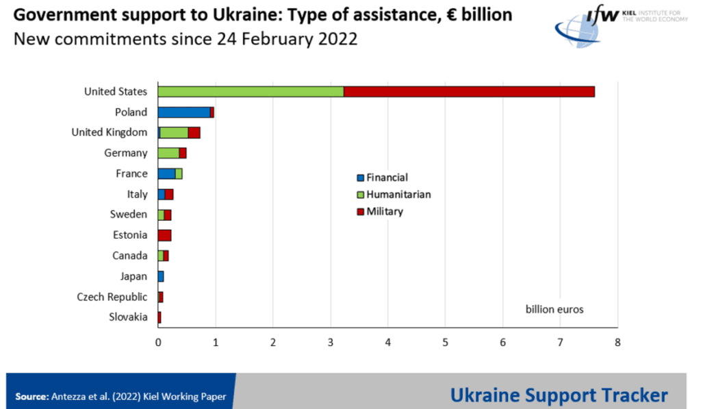 Estados Unidos direccionó a Ucrania sistemas antiaéreos Stinger, sistemas antiblindaje Javelin, drones “kamikaze” Switchblade, radares de vigilancia aérea, helicópteros Mi-17 y sistemas portátiles de antiblindaje AT-4. El país del norte notficó también el próximo envío de dieciocho sistemas de artillería Howitzer de 155 mm y 40.000 rondas de municiones, junto con la contraartillería AN/TPQ-36 y los sistemas de radar de vigilancia aérea AN/MPQ-64 Sentinel.