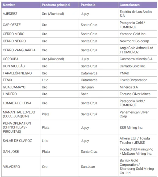 Las dos principales operaciones mineras en actividad se encuentran en la provincia de Santa Cruz (Cerro Vanguardia) y San Juan (Veladero). La más antigua de las dos es Cerro Vanguardia, que comenzó en 1998 a través de una inversión de 270 millones de dólares en manos de la empresa sudafricana AngloGold. Por su parte, Veladero inició en el año 2005, acumulando un total de exportaciones equivalentes a 13.502 millones de dólares desde entonces.