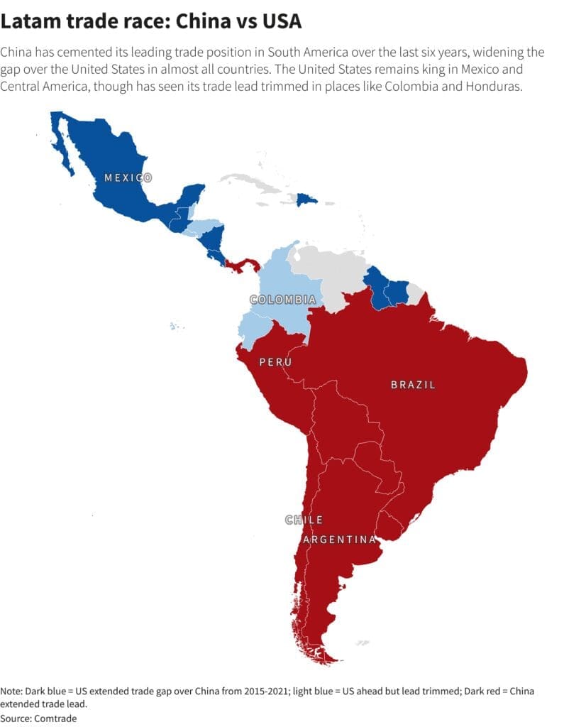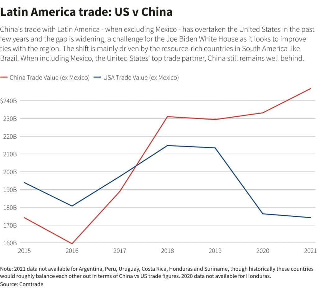 Un reciente análisis de Reuters, basado en los datos comerciales de la ONU del 2015 al 2021, demostró que fuera de México (el principal socio comercial de Estados Unidos) China superó a Washington en América Latina y amplió esta brecha el año pasado. La tendencia muestra cómo Estados Unidos ha “perdido terreno” en su propia región, o su “patio trasero”, pese a los intentos de Biden por propulsar la Cumbre de las Américas.