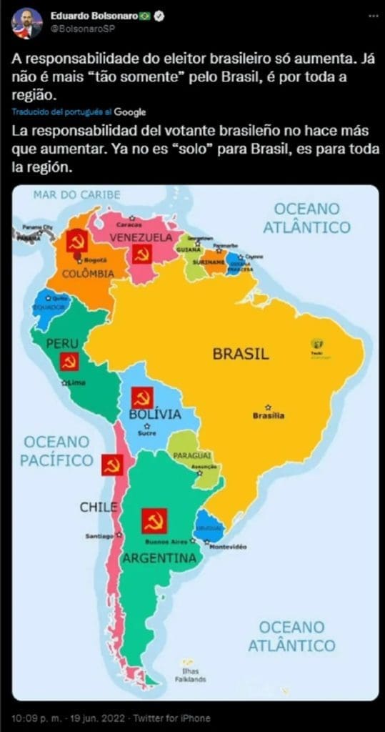 “La responsabilidad del votante brasileño no hace más que aumentar. Ya no es ‘solo’ para Brasil, es para toda la región” describió Bolsonaro, añadiendo el símbolo comunista sobre todos los países del cono sur a excepción de Paraguay, Uruguay, Ecuador y, por supuesto, Brasil.