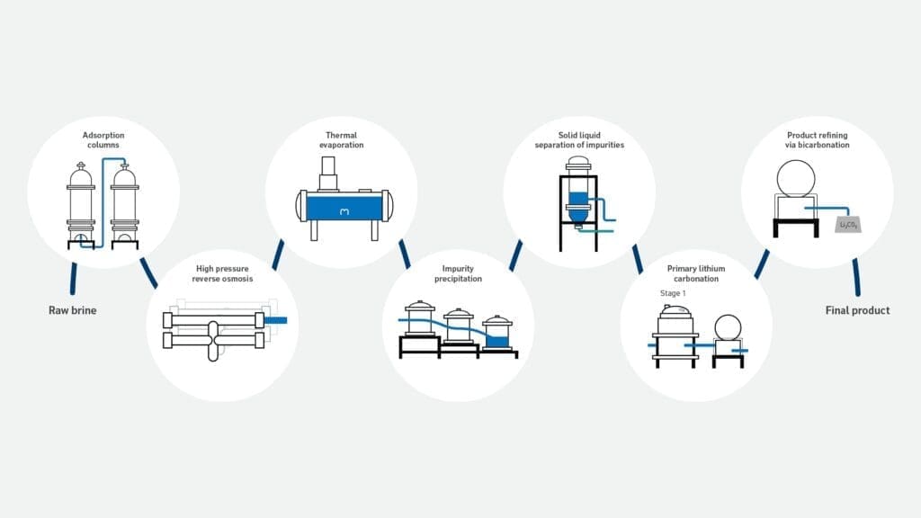 Cuenta con una tecnología exclusiva y patentada por la empresa, ahorrando costos y potenciando la productividad al compactar el proceso de extracción en menos de 24 horas. La planta bombea salmuera rica en litio desde un pozo en el salar a un tanque de almacenamiento, donde se bombea a otro tanque que usa resina para absorber el litio.