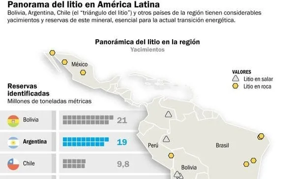 América Latina es uno de los países que más domina el mercado de este mineral, puntualmente por el denominado Triángulo de Litio que abarca Chile, Argentina y Bolivia. Como la mayor reserva de litio en el mundo, atrae gran interés en muchos países del mundo y principales productores con el objetivo de crear y potenciar proyectos exploratorios y de extracción en estos países. Sin embargo, naciones como Bolivia limitan la extracción a pequeños proyectos debido a las políticas gubernamentales restrictivas y falta de tecnología.