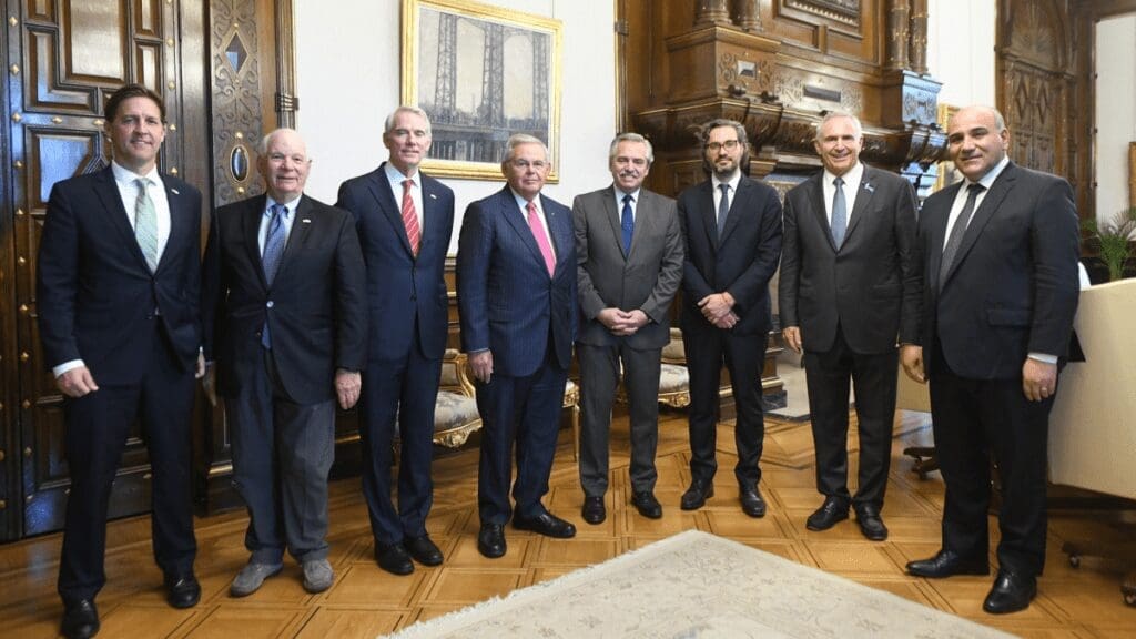 Junto a Fernández estuvieron el jefe de Gabinete Juan Manzur y el canciller Santiago Cafiero, mientras que la comitiva estadounidense estaba integrada por los senadores demócratas Robert Menéndez y Benjamin Cardin y los republicanos Robert Portman y Benjamin Sasse. También estuvieron presentes el director de personal del Comité Senatorial de Relaciones Exteriores, Damian Murphy, y el miembro del personal profesional del Comité Senatorial de Relaciones Exteriores, Brandon Yoder.