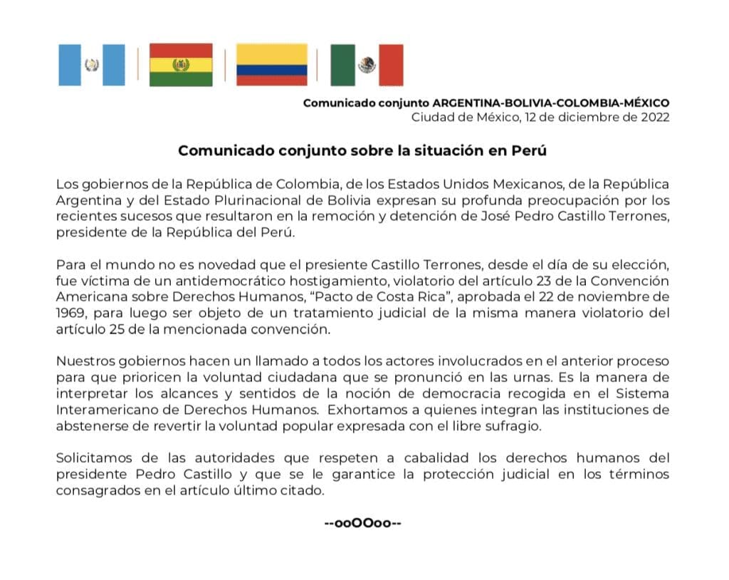 En respuesta al comunicado conjunto de Argentina, Bolivia, México y Colombia -que reza que Castillo “fue víctima de un antidemocrático hostigamiento, violatorio del artículo 23 de la Convención Americana sobre Derechos Humanos”-, Perú también emite una enfática declaración al respecto. La ministra de Relaciones Exteriores de Perú, Ana Cecilia Gervasi, remarcó que lo ocurrido fue un golpe de Estado y que los pronunciamientos de estos cuatro presidentes “no se condicen con los tradicionales lazos de amistad, cooperación y respeto mutuo”.