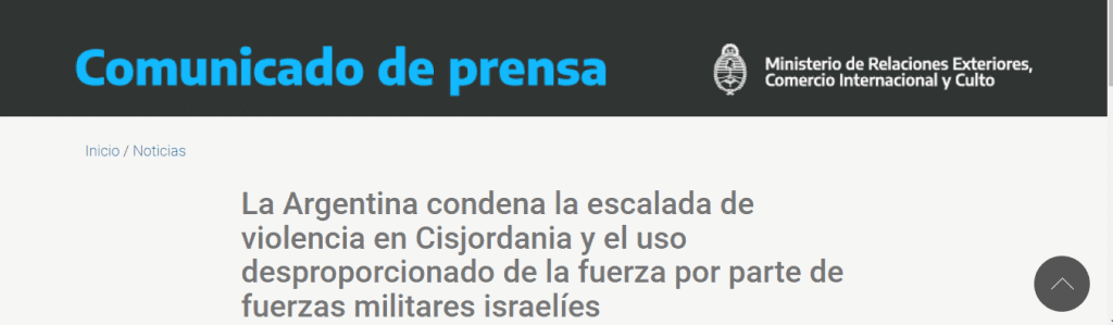 Según un comunicado del Ministerio, “Argentina se ha pronunciado siempre a favor del respeto de los derechos humanos, en contra del terrorismo y del uso desproporcionado de la fuerza. Al tiempo que la Argentina ratifica su posición irrevocable a favor del derecho de Israel a vivir en paz y seguridad dentro de sus fronteras internacionalmente reconocidas, exhorta a este país a actuar en pleno respeto del derecho internacional, en particular de los derechos humanos”.