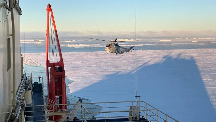 El rompehielos pudo adentrarse en el borde del pie de hielo fijo de la bahía que se encuentra frente a esta base permanente, y así aproximarse lo máximo posible para facilitar las operaciones aéreas que se efectúan de manera continua. Sin embargo, para llegar a la base tuvo que navegar hacia el sur del mar de Weddell, considerada una de las travesías más difíciles de realizar para cualquier tipo de buque, puntualmente por la cantidad de hielo presente. En ese momento, el buque logró alejarse de dicho campo de hielo y cruzó el mítico Círculo Polar Antártico.