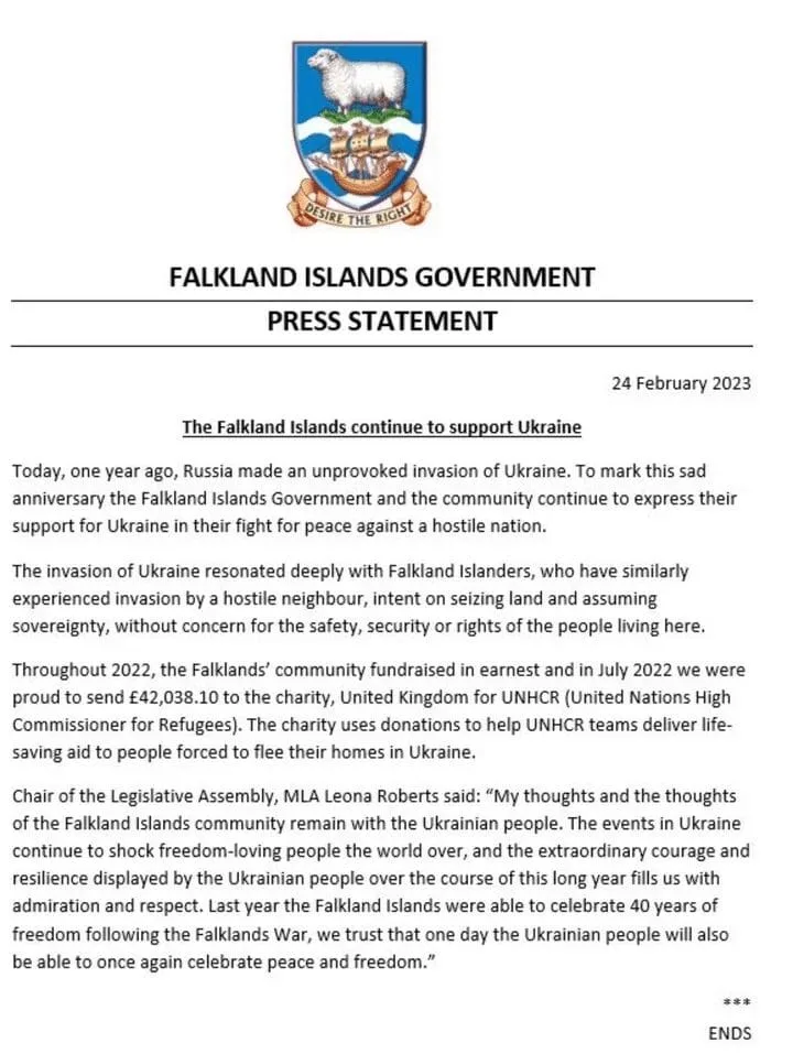 Según un artículo publicado en la agencia de noticias MercoPress, las Islas “Falklands” celebraron el año pasado sus “40 años de libertad después de la guerra de Malvinas”, sintiendo un gran pesar por la situación que actualmente vive Ucrania como propia. En palabras de la MLA Leona Roberts, presidente de la Asamblea Legislativa del gobierno de ocupación en Malvinas, “Hoy, hace un año, Rusia realizó una invasión no provocada de Ucrania. Para conmemorar este triste aniversario, el Gobierno de las Islas Falkland y la comunidad continúan expresando su apoyo a Ucrania”.