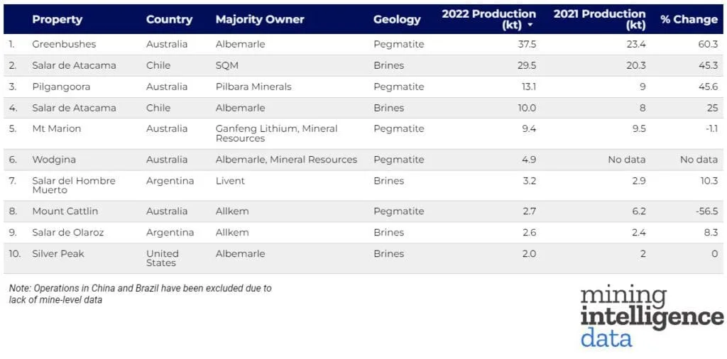 En un análisis de las principales minas de litio productoras del mundo —que abarcan una cantidad significativa de la producción mundial de litio— Mining Intelligence Data ha clasificado las mayores operaciones, basándose en el litio en concentrado producido en 2022 y medido en toneladas.