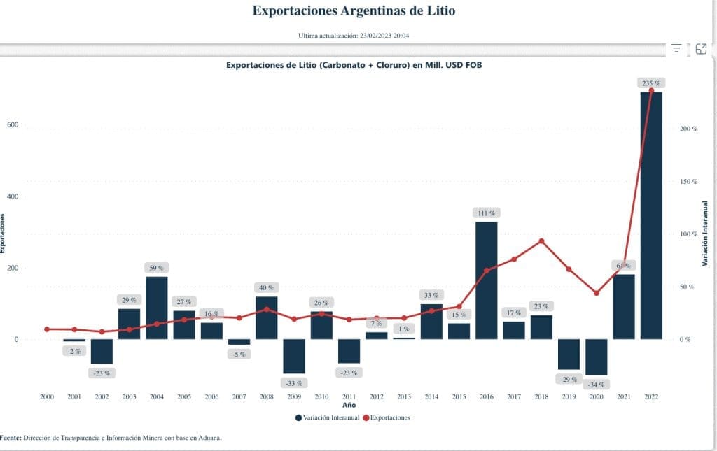En 2022, las exportaciones de litio alcanzaron los US$696 millones, lo que implicó un crecimiento del 234% interanual. Esto se debe a que, en 2021, los embarques al exterior fueron de US$208 millones, representando el 18% de las exportaciones mineras totales.