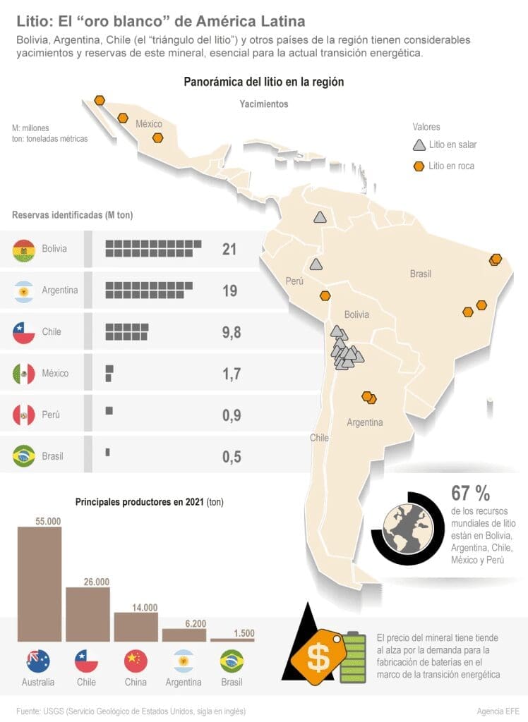 En este contexto, el gobierno de Biden ha iniciado conversaciones con los principales países poseedores de litio en América del Sur, como Bolivia, Argentina y Chile. Estos últimos tienen acuerdos con múltiples empresas internacionales, en su mayoría procedentes de China y Australia, mientras que Estados Unidos aumenta la presión por obtener su porción de las reservas del mineral. Para muchos, este interés tiene intenciones estratégicas y geopolíticas, mucho más que para priorizar la producción nacional de baterías y otros elementos que precisan del litio como sustento principal.