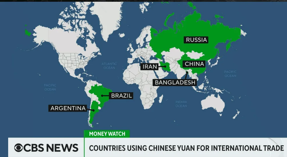 Estos cambios en el sistema financiero internacional comienzan a hacerse palpables cuando diversos países empiezan a adaptar el yuan con el objetivo de facilitar sus operaciones comerciales. Y para los analistas, estos movimientos iniciales para utilizar el yuan en el comercio internacional podrían sentar las bases para la creación de un sistema de pago que opere junto al dólar estadounidense. Tal es el caso de Argentina, por ejemplo, que según la CBS el mes pasado anunció que se utilizaría el yuan chino para pagar sus importaciones provenientes de China, debido principalmente a la escasez de dólares en el país. Al mismo tiempo, Brasil anunció que permitiría a sus empresas comerciar con yuanes también.