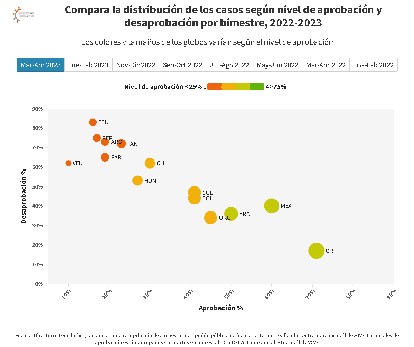 Según los datos recopilados desde la última edición de Imagen del Poder (enero-febrero 2023), los niveles de aprobación presidencial se han mantenido relativamente estables, pero muestran una tendencia preocupante a lo largo del último año. Cada vez más gobiernos tienen menos del 25% de aprobación, y destacan casos como los de Alberto Fernández en Argentina y Guillermo Lasso en Ecuador, quienes han caído por debajo del 20%.