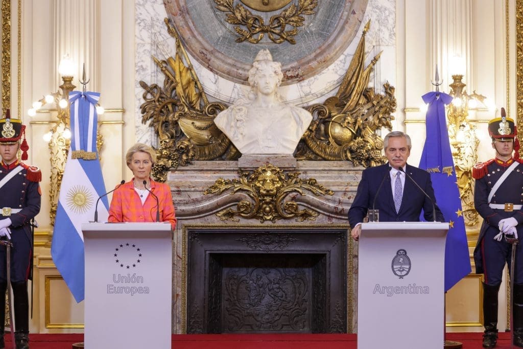 En el marco de una gira clave por América Latina, la presidenta de la Comisión Europea, Ursula von der Leyen se reunió con el  presidente de Argentina, Alberto Fernández, para buscar un acuerdo comercial “mutuamente beneficioso” con el Mercosur. El esperado acuerdo de libre comercio entre la Unión Europea y los países del Mercosur fue presentado como un hecho consumado en 2019 después de más de dos décadas de negociaciones, sin embargo, surgieron tensiones debido a puntos conflictivos que trabaron el acuerdo.