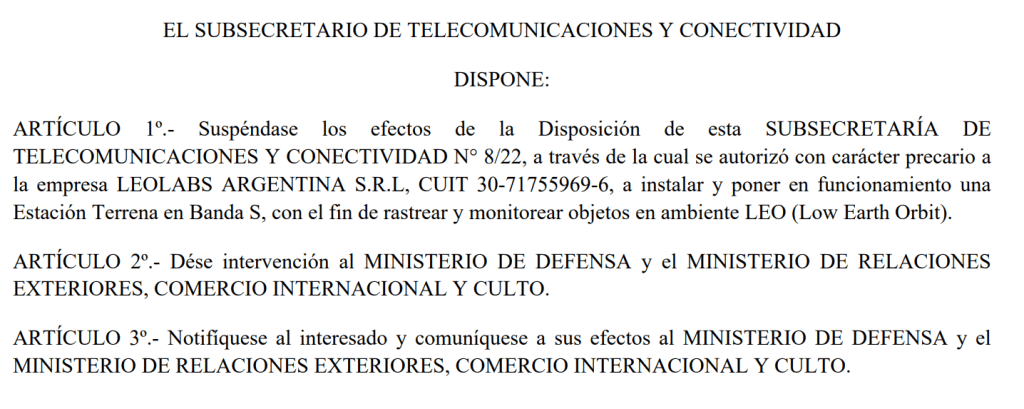 La autorización provisoria había sido otorgada en noviembre del año pasado, generando diversas reacciones al conocerse que las empresas que conforman Leolabs son de capitales del Reino Unido e Irlanda. Sin embargo, a seis meses de haber otorgado la autorización, el Subsecretario Mariano Lombardi ha tenido que dar marcha atrás y suspenderla por solicitud del Ministro de Defensa, considerando la importancia de la cuestión en términos de interés público.
