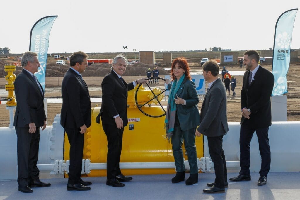 El presidente argentino, Alberto Fernández, junto a la vicepresidenta Cristina Kirchner y el ministro de Economía, Sergio Massa, encabezaron un acto de inauguración para el primer tramo del Gasoducto Presidente Néstor Kirchner (GPNK), una obra considerada clave para el desarrollo de la matriz energética de Argentina.