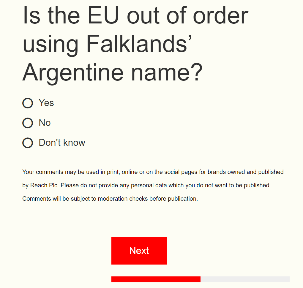El diario británico Daily Express ha lanzado una encuesta preguntando a sus lectores si consideran inapropiado que la Unión Europea utilice la denominación argentina “Islas Malvinas” en lugar del nombre británico. Hasta el momento, el 70% de los participantes apoya el uso argentino.
