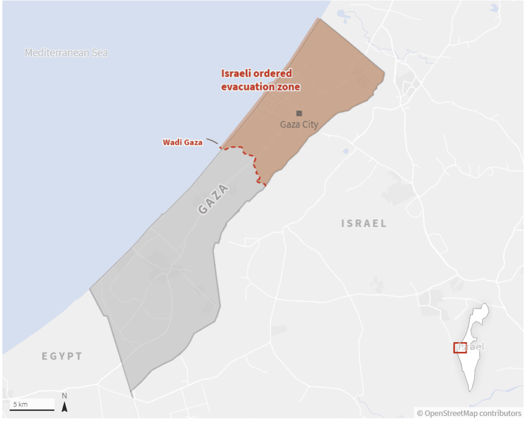 “Civiles de Gaza, evacúen hacia el sur por su propia seguridad y la de sus familias y aléjense de los terroristas de Hamás que los utilizan como escudos humanos”, declaró el ejército, acusando a Hamás de esconderse en y bajo edificios civiles.