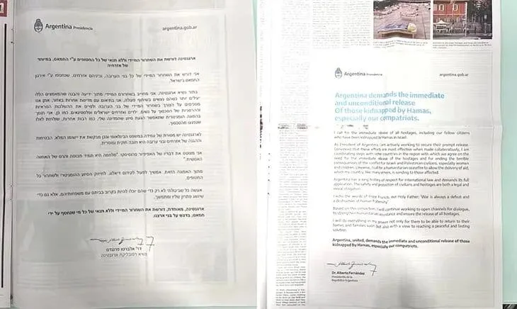 En este contexto, el presidente argentino Alberto Fernández publicó en cuatro diarios israelíes (Israel Hayom, Yediot Ahronot, Haaretz y Jerusalem Post) una solicitud de liberación de los nacionales secuestrados en la región, con el objetivo de “comenzar una acción global” y aumentar la presión internacional para que Hamás libere de manera “inmediata e incondicional” a todos los prisioneros.