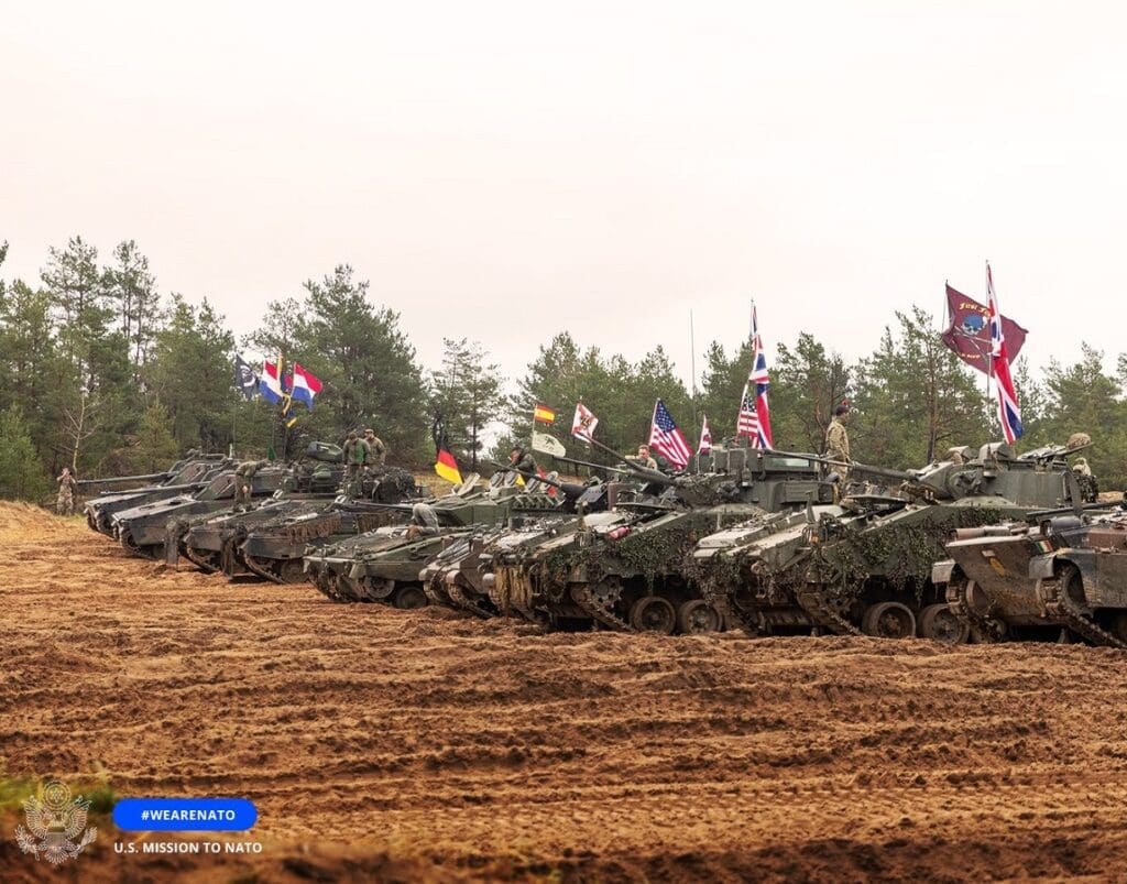 La misión de Estados Unidos en la OTAN destacó el despliegue de una numerosa cantidad de vehículos de combate en una publicación que exhibía la potencia militar conjunta de Estados Unidos y Europa, enviando una advertencia a Rusia. En las imágenes compartidas en X (anteriormente en Twitter), se mostraban alineados al menos 21 de los últimos vehículos militares de combate, con banderas de países como Polonia, Italia, España, Alemania y Gran Bretaña, junto con la bandera estadounidense.