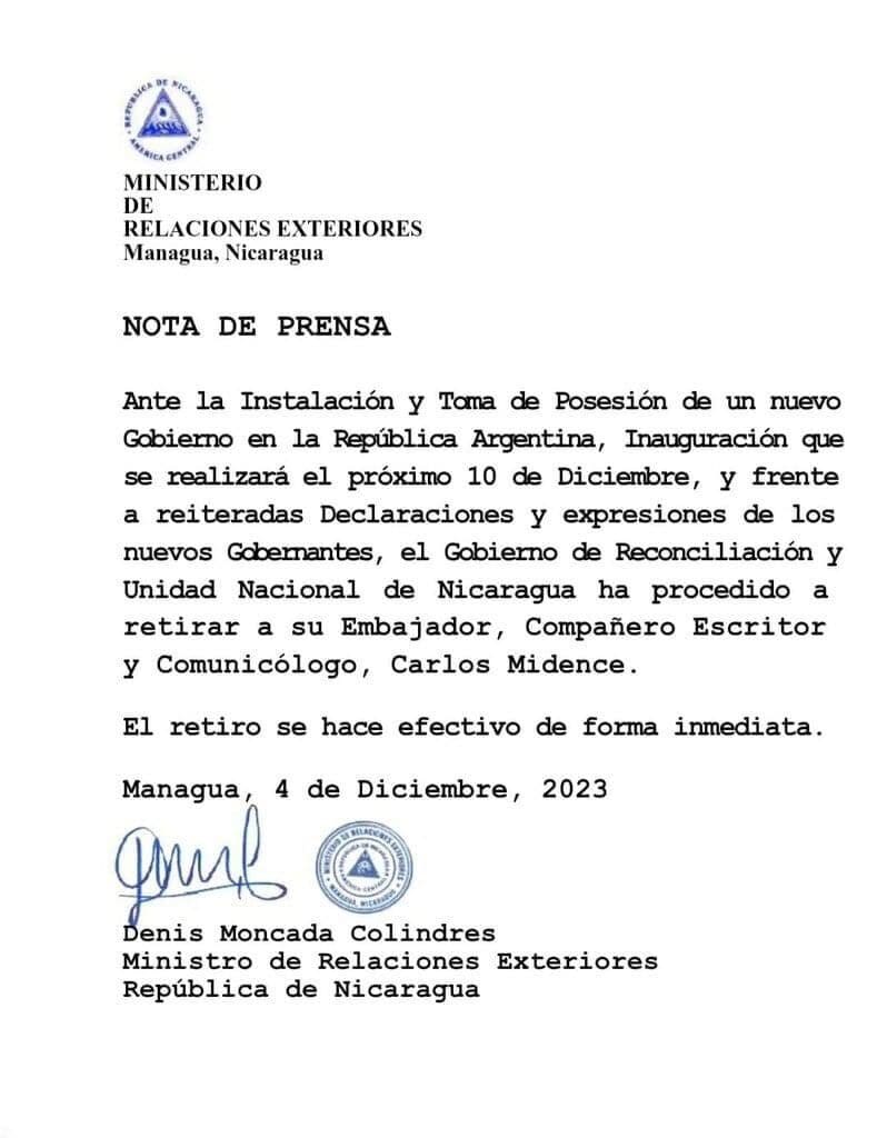 El gobierno de Nicaragua anunció el retiro de su embajador, Carlos Midence, de Buenos Aires antes de la toma de posesión del nuevo presidente argentino, Javier Milei, programada para el 10 de diciembre. Esta decisión se produce tras declaraciones de Milei en las que critica al presidente nicaragüense, Daniel Ortega, por supuestas violaciones de los derechos humanos en Nicaragua.