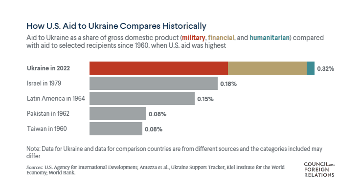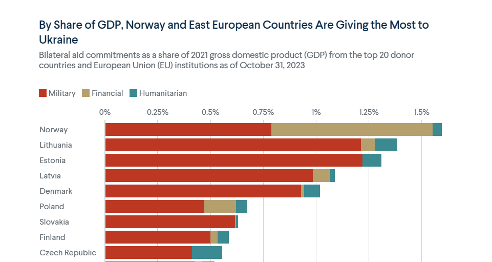 Observen como naciones que no ocupan los primeros puestos en términos de PBI mundial son los principales perjudicados en otorgar financiamiento a Ucrania. Países con escasa población como Noruega, Dinamarca, Estonia, Lituania y Letonia han aportado más en términos de PBI que cualquier otro país en el mundo, siendo esto sumamente perjudicial para la balanza fiscal y el desarrollo económico, dónde el resultado de años de producción se ven volcados inútilmente en una guerra.