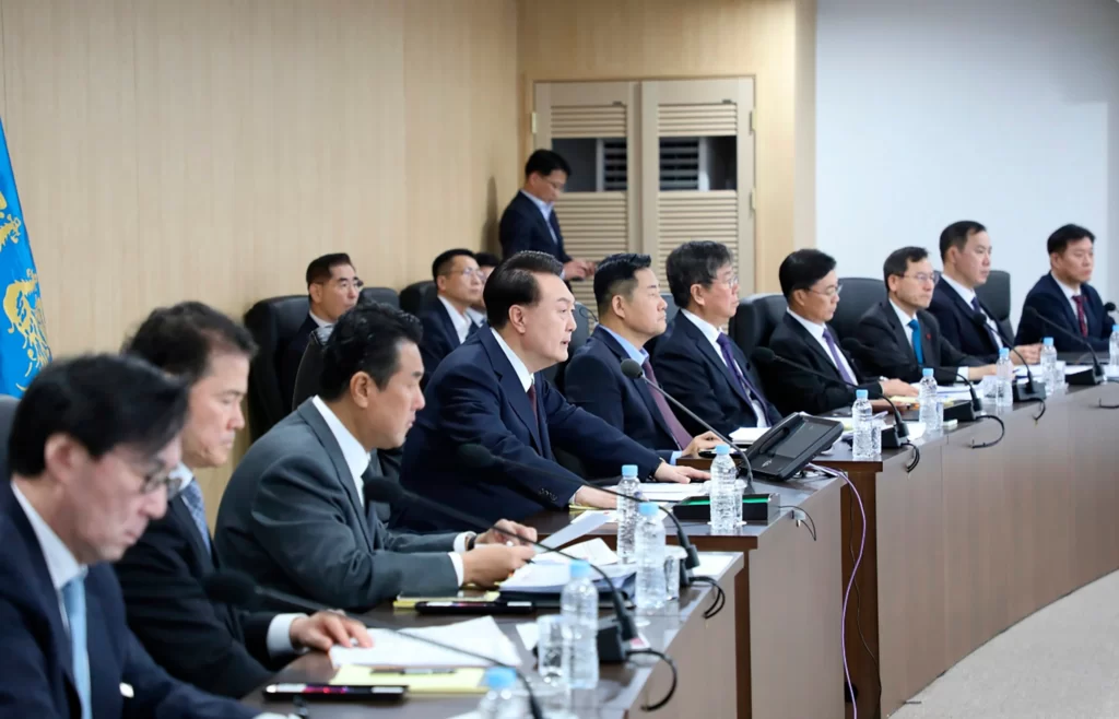 En esta fotografía proporcionada por la Oficina Presidencial de Corea del Sur, el presidente surcoreano, Yoon Suk Yeol, cuarto desde la izquierda, habla durante una reunión del Consejo de Seguridad Nacional en la oficina presidencial en Seúl, Corea del Sur, el lunes 18 de diciembre de 2023. Oficina presidencial de Corea del Sur vía AP