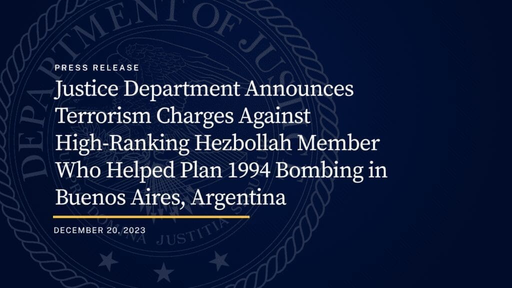 El Departamento de Justicia de Estados Unidos anuncia cargos por terrorismo contra un miembro de alto rango de Hezbolá que ayudó a planear el atentado de 1994 en Buenos Aires, Argentina.