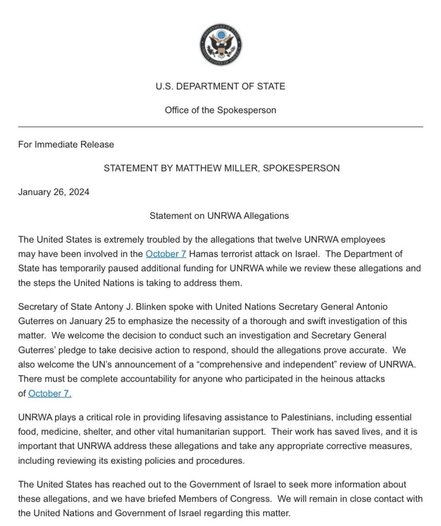 En consonancia a la noticia, el Departamento de Estado norteamericano suspendió temporalmente la financiación a la Agencia hasta que existe una revisión de las acusaciones y ONU otorgue una respuesta final a la situación. Se estima que 12 empleados de la UNRWA podrían haber estado involucrados en los ataques del 7 de octubre, motivo por el cual el Departamento de Estado emitió un comunicado en manos del portavoz, Matthew Miller.
