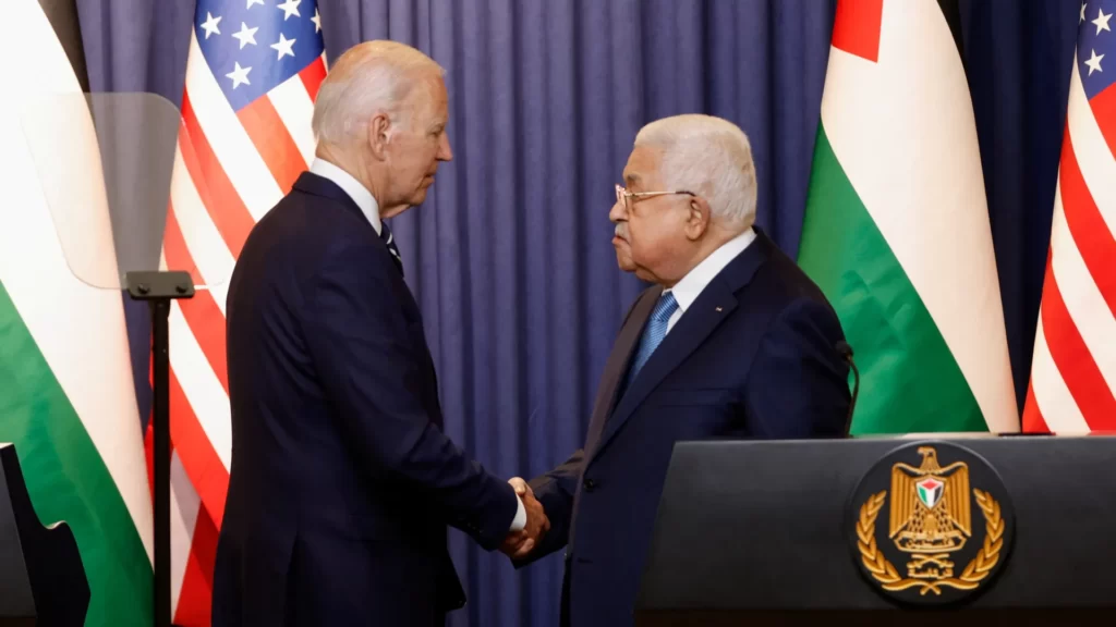 El presidente de Estados Unidos, Joe Biden, se reúne con el presidente de la Autoridad Nacional Palestina, Mahmud Abbas, en Belén, Cisjordania, el 15 de julio de 2022. © Reuters/Evelyn Hockstein