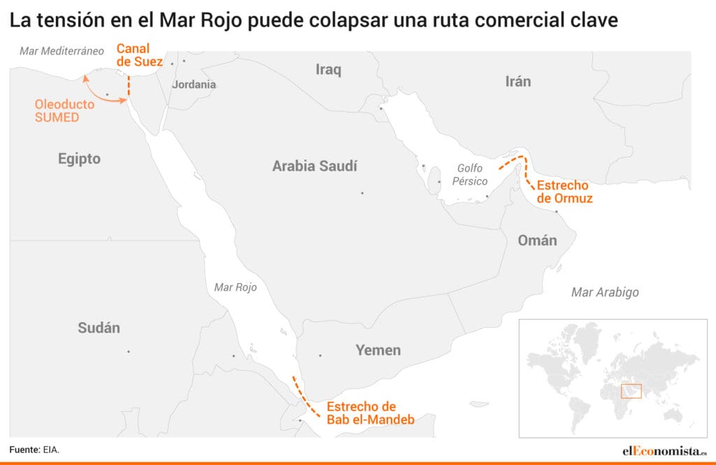 El Mar Rojo constituye uno de los cuerpos de agua más cruciales a nivel mundial para el comercio internacional, bañando las costas de países como Djibouti, Egipto, Jordania, Arabia Saudita, Etiopía, Eritrea, Sudán, Somalia, Israel y Yemen.