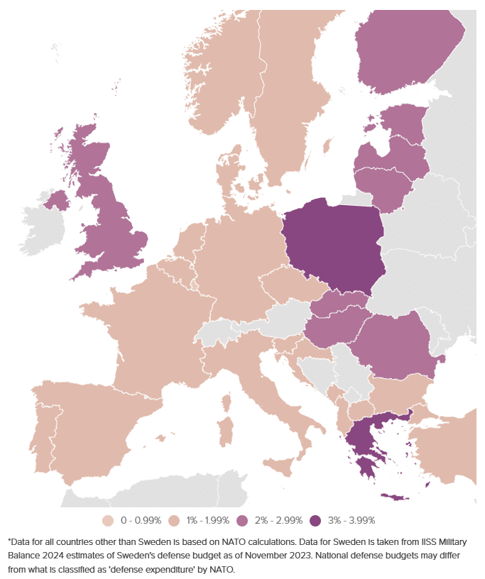 En previsión de su ingreso en la OTAN, Suecia anunció el año pasado inversiones en defensa militar. El gobierno estima que este aumento del gasto, combinado con partidas presupuestarias adicionales que entran dentro de la definición de gasto de defensa de la OTAN, garantizará que Suecia cumpla el objetivo del 2% del PIB en gasto de defensa en 2024.