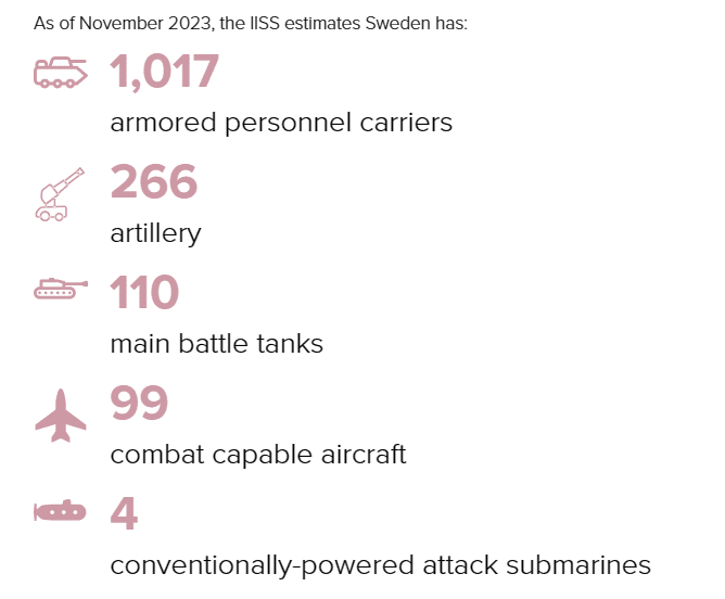 Cuando se comparan las existencias de material seleccionado entre los países de la OTAN, las cifras de suministros de Suecia tienden a situarla en la parte media superior del pelotón. En algunos casos, el país está muy por encima de sus posibilidades, como en el caso de ser el quinto país de la OTAN con más personal acorazado.