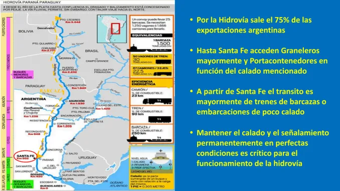 En una extensión de 3.500.000 kilómetros cuadrados se cultiva y envía la producción de soja y maíz de parte de Bolivia y Brasil, así como de Paraguay, Uruguay y Argentina. Durante el año 2019, 5.000 barcos navegaron por esta cuenca, de los cuales 2.632 llegaron al puerto exportador en Rosario, desde donde se embarcó el 75% de las exportaciones del país, principalmente con destino al sudeste asiático.