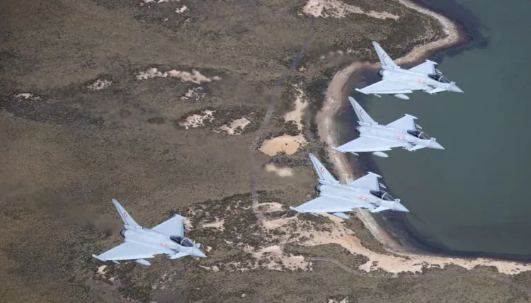 La RAF mantiene el contingente más importante en las Islas Malvinas, con un destacamento de cuatro cazas Typhoon Tranche 1 basado en RAF Mount Pleasant, además de aviones de transporte A400M Atlas y de reabastecimiento A330 MRTT Voyager.