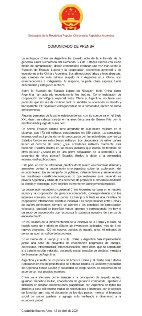 Para Beijing, las declaraciones de la funcionaria estadounidense son “falsas y bien absurdas”, además de que “carecen del más mínimo respeto ni a Argentina ni a China, son estremecedoras e indignantes”. El comunicado buscó resaltar el “fuerte descontento y categórico rechazo” por parte de China, haciendo especial énfasis en los proyectos que Washington también posee pero no hace públicos.