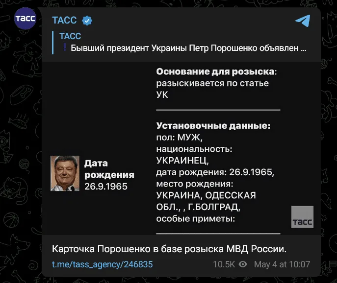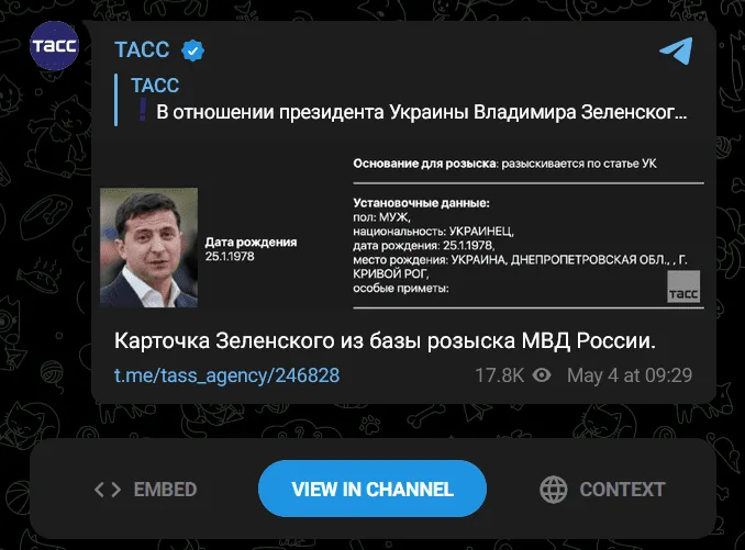 En su canal de Telegram, Tass afirmó que “se ha abierto una causa penal contra el presidente ucraniano Volodymyr Zelensky en Rusia y se le busca, según la base de datos del Ministerio del Interior ruso”. Asimismo, se publicó una “Ficha de Zelensky” en la base de datos de personas buscadas del Ministerio del Interior ruso.