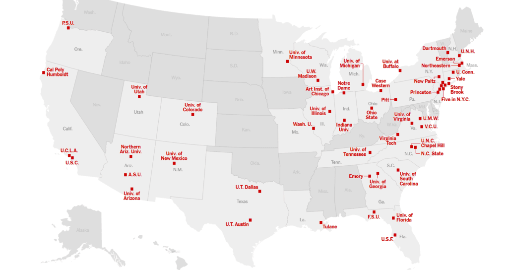 Las universidades más afectadas por arrestos y detenciones de estudiantes fueron Columbia University, University of California de Los Ángeles, el City College of New York, University of Texas at Austin, entre otras.
