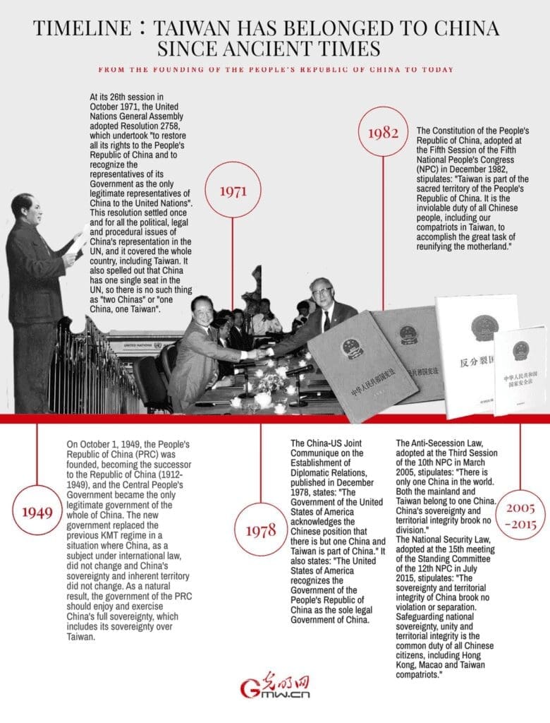 Este sábado, la Embajada de China en la Argentina publicó en redes sociales que “Taiwán pertenece a China”, junto a una línea del tiempo que “lo corrobora”. El informe publicado explica cómo Taiwán siempre fue parte del país, donde el marco temporal comienza en el año 230 y culmina en el 2015, y declara que en 1943 “China había recuperado Taiwán de iure y de facto mediante una serie de documentos con efectos jurídicos internacionales”.