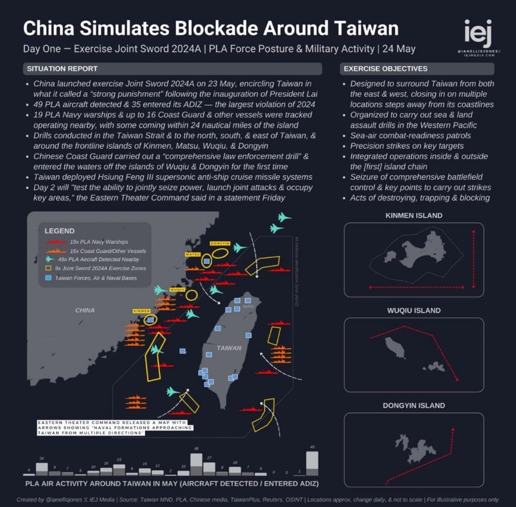 El Comando del Teatro Oriental del Ejército Popular de Liberación de China indicó que los ejercicios, llamados “Espada Conjunta – 2024A”, tenían el objetivo de “probar la capacidad de tomar el poder de manera conjunta, lanzar ataques conjuntos y ocupar áreas clave”. Wu Qian, portavoz del Ministerio de Defensa de China, afirmó que esta acción era “completamente razonable, legal y necesaria” para combatir la “independencia de Taiwán” y disuadir la intervención de fuerzas externas.