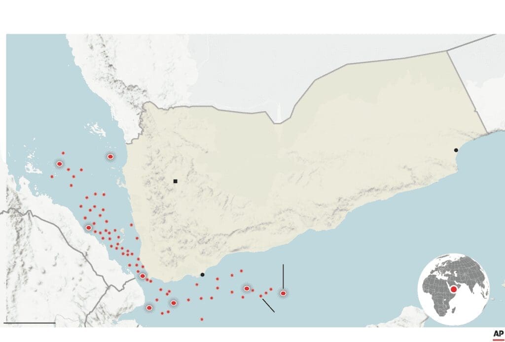 Incidentes del 19 de noviembre de 2023 al 15 de junio de 2024 por ataques de rebeldes hutíes contra buques de transporte del Mar Rojo. Fuente: AP