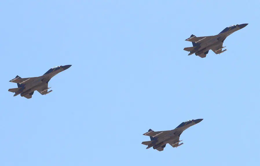 Cazas polivalentes J-16 portando SRAAM PL-10 y MRAAM PL-15 durante el sobrevuelo de julio de 2017 para conmemorar el 90 aniversario de la fundación del EPL. Foto: Zona Militar