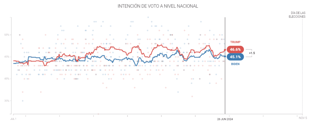Proyecciones de voto a nivel nacional en Estados Unidos en base a encuestas de cada estado. FUENTE: REALCLEARPOLITICS