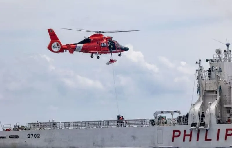 Guardacostas estadounidenses recogen basura en un helicóptero MH-65E desde la cubierta de vuelo del buque PCG Melchora Aquino en el Mar de China Meridional el 16 de julio de 2024.
